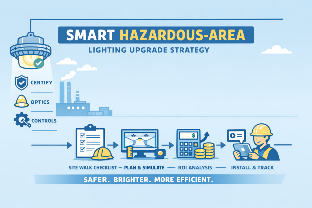 What if hazardous-area lights could self-check, slash power use, and make audits painless? Sounds bold—until you map the right standards, optics, and data. Here’s the fast path, plus the choices that matter next. Key Takeaways Why Hazardous-Area Lighting Is at a Breaking Point Safety, uptime, and energy. That’s the triangle. Most sites run legacy HID or mixed LED families, patched over years. Heat, vibration, and dust don’t care about purchase orders. Audits come fast, and maintenance logs feel endless. One missed label or wrong optic in a gas zone can turn into downtime—fast. Budgets are tight, yet the target is zero incidents and lower kWh. The old “replace only when it fails” approach drags costs higher and keeps risks hanging around. Why Hazardous-Area Lighting Is at a Breaking Point Here’s the shift: modern luminaires bring thermal intelligence, sealed optics, high CRI for inspections, and digital IDs that tie to asset systems. The result is clearer task lighting, less glare, and fewer unplanned lifts. You get predictable maintenance cycles and clean documentation for every fixture. That means safer crews and calmer audits, while energy spend drops. And yes, this includes explosion-proof lighting lines that now talk to gateways or even run diagnostics at the edge. Start With the Environment, Not the Product Catalog Every strong lighting plan begins with conditions, not SKUs. Identify the gases, vapors, or dusts present. Confirm the Zone or Division and the required temperature class. Heat is often the silent limiter. LEDs perform best when thermal load stays controlled, and housing design plays a major role in keeping junction temperatures down. Think of heat like extra weight. As it builds, performance slows and lifespan shortens. Well-designed thermal paths remove that weight, protecting lumen output and extending service life. From there, optics come into focus. Wide beams suit open production floors. Narrow distributions work better in corridors. Asymmetric optics shine on catwalks, racks, and inspection lanes. Each optic acts like a brush. The wrong one wastes light and adds fixtures. The right one delivers clean coverage with fewer points. Document key technical terms as you go. ATEX and IECEx classifications, UL844, Class I Division ratings, ingress protection, IK impact resistance, surge protection, and control options all matter later when audits and approvals arrive. A Practical Decision Framework for Hazardous-Area Lighting Upgrades Instead of treating every requirement as equal, tier your decisions. This keeps projects focused and defensible Tiered Decision Framework Planning Table Step What to Do Tool Time Output 1 Map Zones/Divisions & T-codes Site drawings + last audit 1–2 hrs Risk-based area list 2 Capture Heights & Tasks Laser measure, camera 1 hr Mount heights + task notes 3 Pick Optics per Area Photometric sim 2–4 hrs Layout + fixture counts 4 Select Controls Tier Controls matrix 1 hr Sensor/network plan 5 Verify Cert & Materials Spec sheets 30–60 min Compliant shortlist 6 Run ROI & Power kWh calc sheet 30–60 min Payback estimate 7 Create Asset IDs CMMS template 30 min Maintenance plan 10-Step Hazardous-Area Lighting Site-Walk Checklist With this framework and checklist, choices turn into a staged rollout—so action becomes the obvious next move. ROI Calculation for Hazardous-Area LED Lighting Upgrades Week 1 — Scope & Data Week 2 — Design & Sim Week 3 — ROI & Buy-In Week 4 — Install & Document Worked Example (Numbers You Can Swap) Tools, Prompts, Templates Lock down these steps, and the pilot becomes a blueprint for broader rollouts—including explosion-proof lighting refreshes in adjacent areas. Conclusion Smarter hazardous-area lighting delivers safer sites, sharper visibility, and lower operating costs. Legacy systems built on heat, guesswork optics, and scattered documentation drain time and trust. The modern approach is simpler. Certify first. Match optics to tasks. Add only the controls you need. Track every fixture like a critical asset. When upgrades follow a clear framework and roll out in short sprints, audits calm down, crews work with confidence, and energy use drops without disrupting production. Explosion-proof lighting doesn’t have to feel specialized or fragile. Done right, it becomes part of the infrastructure, reliable, efficient, and built in from day one.