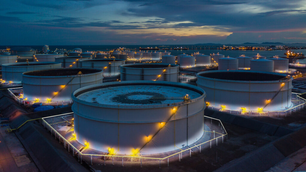 Aerial view oil storage tank terminal and tanker, petrol industrial zone.